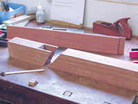 Cortando la garganta de la abrazadera del bloque del dedo del pie en un vicio y, usando una sierra de la espiga, cortar hacia el lado inútil de las líneas de diseño. Hice cortes adicionales para hacer más fácil cortar los residuos. Retire el material entre las líneas usando un cincel y un mazo. La parte superior de la garganta primero, y luego vuelva a colocar el bloque en el vicio y vio y picamos del tramo inferior. Con el material de desecho eliminado, utilice un cincel de pelado para limpiar las superficies. Que es las mejillas y los bloques de centro listo para pegar encima, Foto 4.