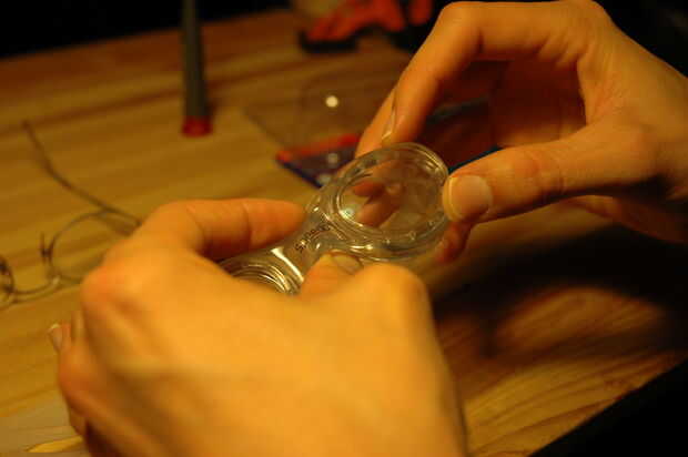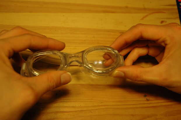 Las lentes deben superponerse al menos el marco de las gafas en los lados izquierdo y derecho. Esto es la cantidad mínima de la zona de pegamento que usted necesita, como se muestra en las fotos de las gafas claro abajo. En este caso, la parte superior y el borde inferior será abiertas, permitiendo que el agua fluya libremente entre el lente de los vidrios y la lente de los anteojos. Esta es probablemente la solución más fácil y más confiable.