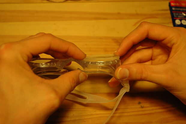 Si las lentes son planas y se superponen completamente los marcos de anteojos, como lo demuestran las gafas color de rosa en la imagen siguiente, entonces usted puede aplicar el pegamento alrededor de todo el camino. Esto es arriesgado, porque puede acabar con fugas. Por lo tanto, recomiendo poner un espaciador temporal entre las lentes y las gafas para permitir un espacio de 1 a 2mm y sólo aplicar pegamento a los bordes, dejando un espacio en la parte superior e inferior para que el agua fluya a través.