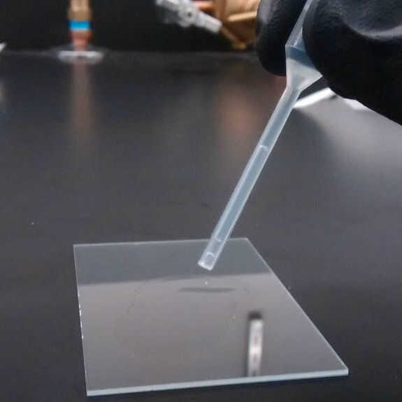 El portaobjetos de cristal se trata con la cartilla. 2-3 gotas de la cartilla se retiraron a un lado de la diapositiva de cristal y había extendido fino con el papel para limpiar. Fue secado durante al menos 1 hora. No espere demasiado antes de usar el cristal preparado, podría disminuir el efecto de la cartilla.