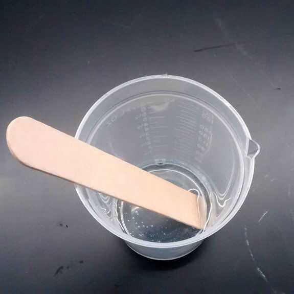 Las dos partes se mezclaron bien con el palillo del revolvimiento. Esto introdujo una gran cantidad de burbujas, que no es deseado. Para deshacerse de él, la mezcla se pone en el vacío y permaneció dentro durante unos 30 minutos. Esto ayudó a las burbujas a subir a la superficie y pop. No todas las burbujas se habían ido, pero no importaba, porque lo fue limpiado con la aspiradora otra vez en el paso siguiente.