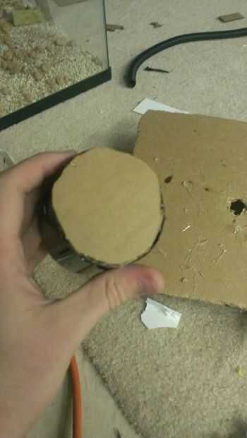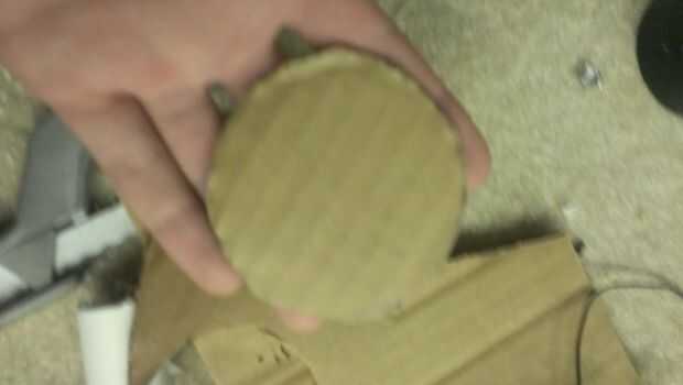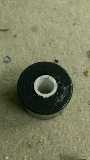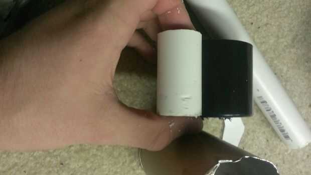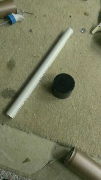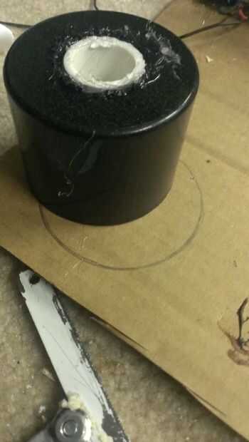 Tomar una tapa de la pintura de aerosol y dremel un agujero a través del centro. Pegar un tubo de pvc igual a la longitud de la tapa en el agujero. Remontar la tapa en cartulina y recortar. Por último, pegar el cartón a la tapa.