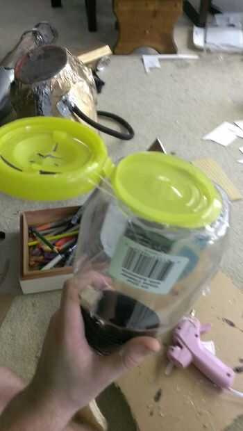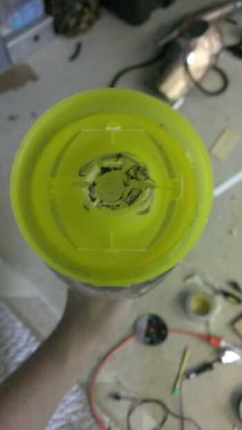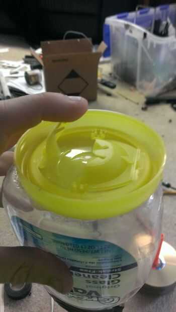 usé una tapa de toallita Clorox para asegurar el cañón en su lugar. Simplemente lo pegue en la parte frontal de la botella. Luego use una dremel para limpiar un orificio para el cañón.