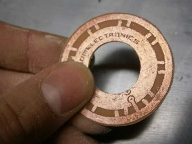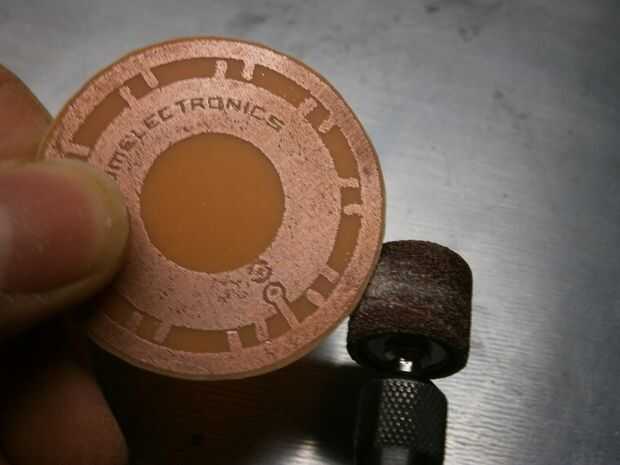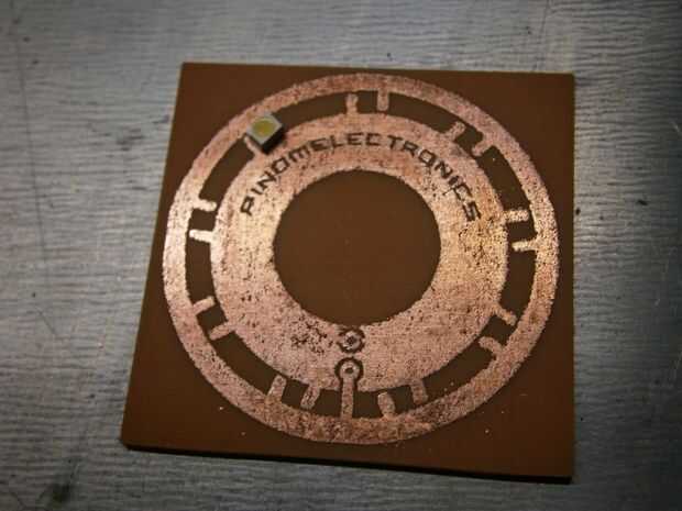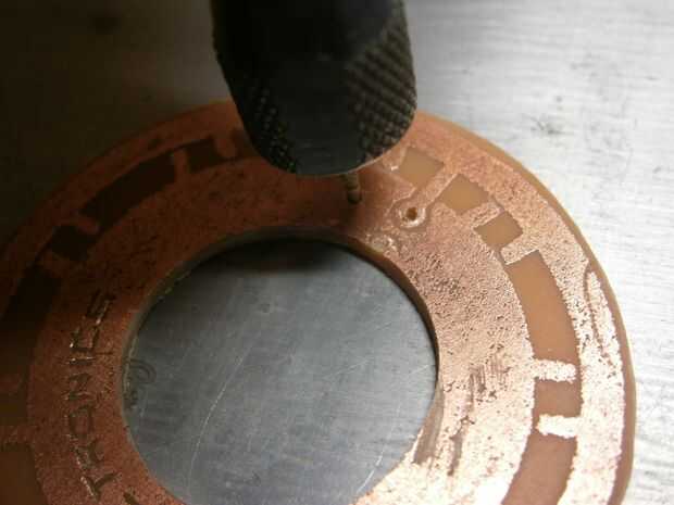 En primer lugar, tienes que imprimir el PCB, (Asegúrese de que tiene el tamaño adecuado para tus LEDs y el tornillo dremel). Luego, corte las esquinas y archivo el borde exterior. Taladre el agujero del centro y hacerlo más grande hasta tha dremel prfectly en él. Luego perfore los orificios para el conector hembra y la resistencia y que ha terminado el PCB.