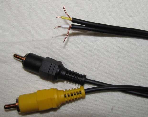 Para mi cable he utilizado una cámara vieja A / V cable ya no utilizaba, pero cualquier cable con dos conectores RCA macho funcionará. Si no tienes un cable como este puede evitar, usted puede crear su propio con dos conectores RCA. Cortar el A / V cable en el extremo opuesto de los conectores RCA y los cables de la tira.
