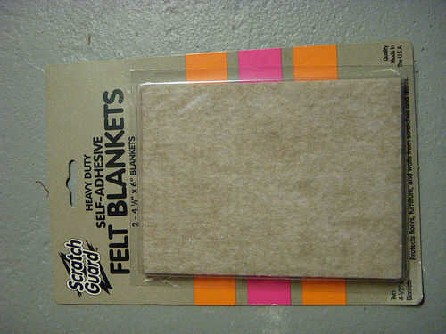 Fieltros , estos son para la parte inferior del candelabro, y protegen la superficie en la que coloca el candelabro acabado. Tenía "Scratch Guard" autoadhesivos sentía mantas sobrantes de un proyecto mucho mayor, así que mi costo es $0. Para le gente mantener grifos en casa, un artículo similar está disponible en de Lowe's por $3.99.