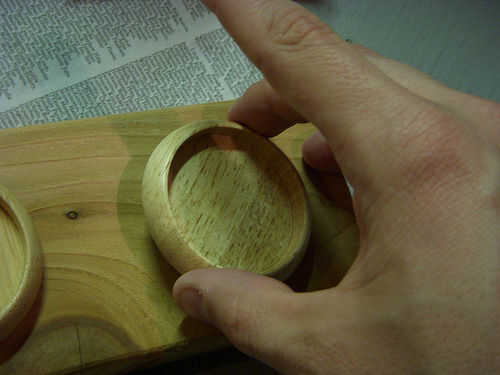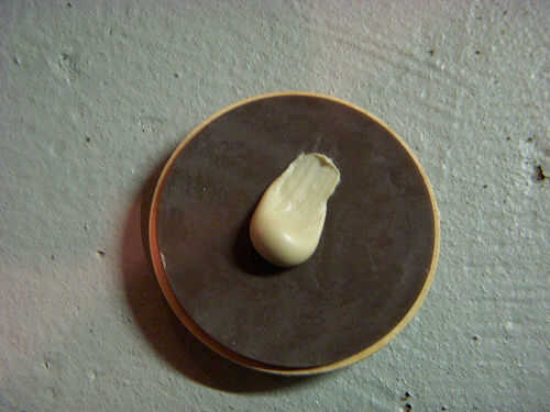 Tomar la primera rueda, dan la vuelta y coloque una cucharada de clavos de líquido en el fondo de centro. Masa debe ser no más de un centavo de ancho. (Ver segunda imagen).