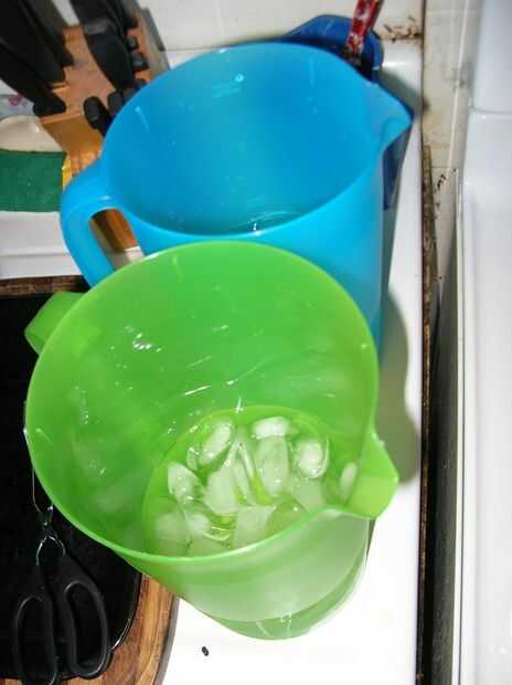 En primer lugar, tienes envases para el agua y el hielo.  Usé 2 recipientes de un galón y 3 bandejas de hielo.  Me divide el hielo entre los envases y añadir agua fría hasta que el hielo estaba flotando cerca de 4 pulgadas.