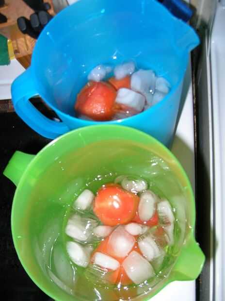 Después de un minuto, haz unas tenazas o un tenedor, tomar tomates en agua hirviendo y poner directamente en el agua helada.