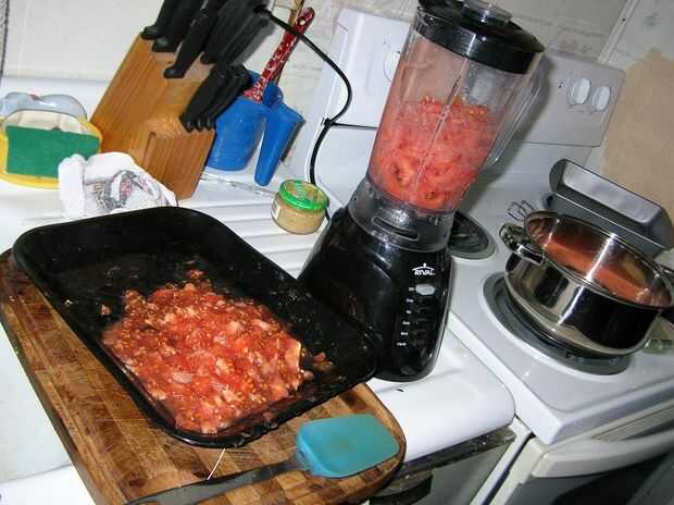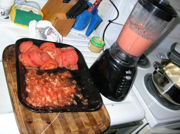 Una vez que usted separa el tomate se pone el tomate en la licuadora y batir durante 2 minutos.  Yo la mitad de mis tomates mezclados a la vez.