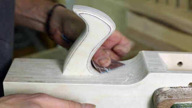 Es tan importante en este paso para dejar la base donde colocaremos la hoja completamente plana para evitar vibraciones que podrían dejar marcas de rasguño cuando usando el cepillo de mano, con papel de lija pegado a un bloque de madera, arena la base de la cepilladora de mano para dejarla perfectamente cuadrado. Si no, no funcionará correctamente, se pueden dibujar algunas marcas paralelas con un lápiz por lo que se puede saber cuando se hace el trabajo. Puede utilizar una escofina para Plaza el agujero del disco.