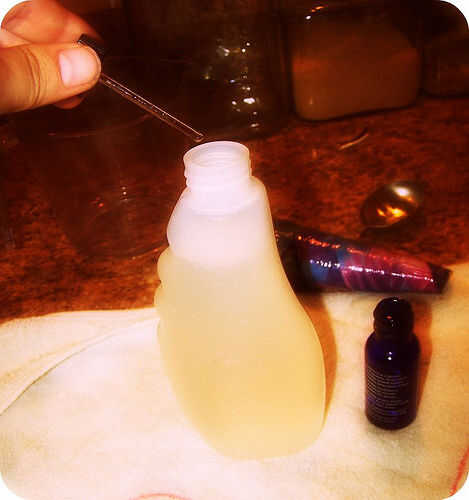 Añadir 10-20 gotas de cualquier aceite esencial. No es necesario, pero seguro ayuda a deshacerse del olor del vinagre en la ducha!
