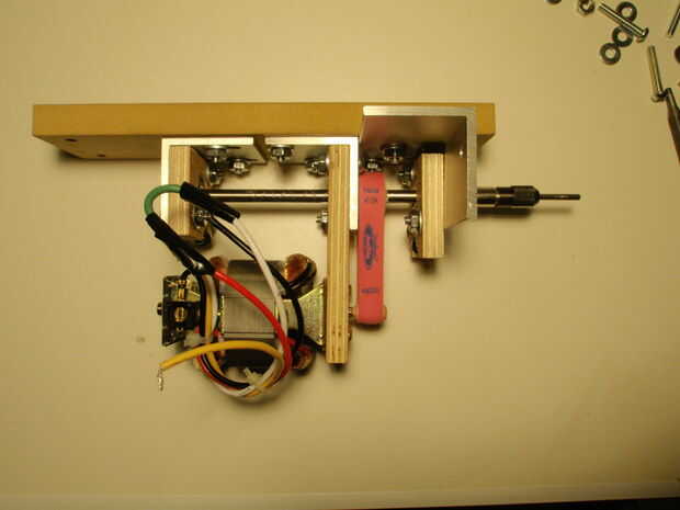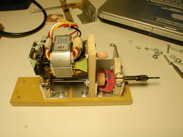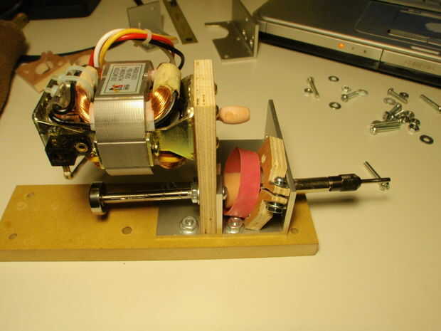 10.3 Conecte el motor a la placa del motor usando los tornillos de montaje que llevó a cabo el motor a la parte de que fue tomado. No tienes la polea en sin embargo, como se muestra en la foto #10. Salvado este motor de un viejo jefe de energía del vacío, pero también han visto la misma unidad en una trituradora de papel nueva. Parecen ser un elemento genérico y cavar un poco uno debe subir.