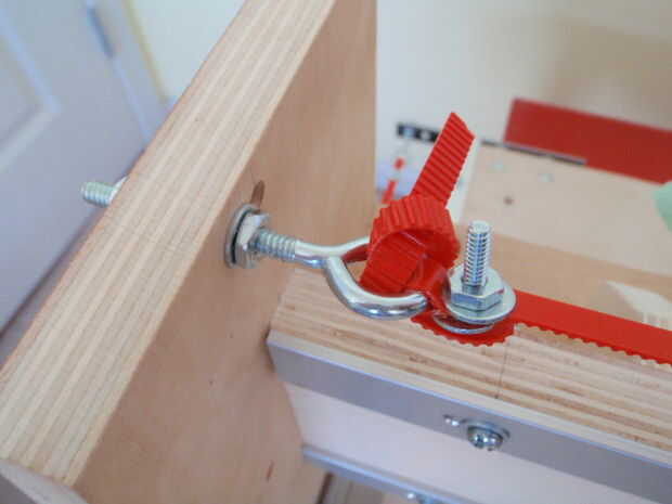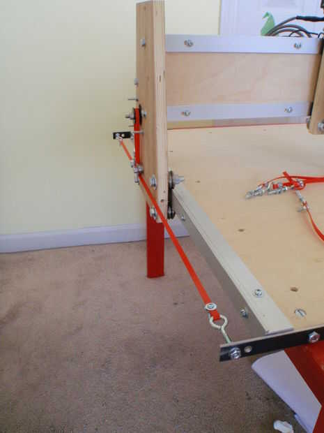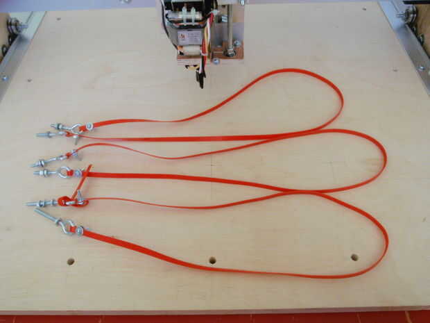 13.4 para el eje y, pase las correas alrededor de la polea y rodamientos de rodillos y luego perno los pernos de ojo para las abrazaderas de correa de acero (fotos #7-9). El eje y fue diseñado para ser la longitud correcta de los cinturones usados por lo que no hay exceso. Las ranuras de las abrazaderas de correa son demasiado grandes para permitir ajustes en la colocación de la correa; ajustar para que la cinta se alinea con los rodamientos de rodillos y el ojo es lo suficientemente lejos de la base que borra la parte de pórtico cuando se encuentra en la parte de su recorrido.