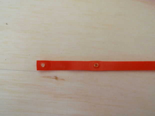 13.2 taladro/punzón los agujeros en las correas de distribución en los puntos marcan. Use un taladro de 1/8" o un punzón para formar los agujeros. El material será flexible y el agujero resultante será más pequeño que el diámetro de la broca. Los agujeros deben ser similares a los de la foto #3.