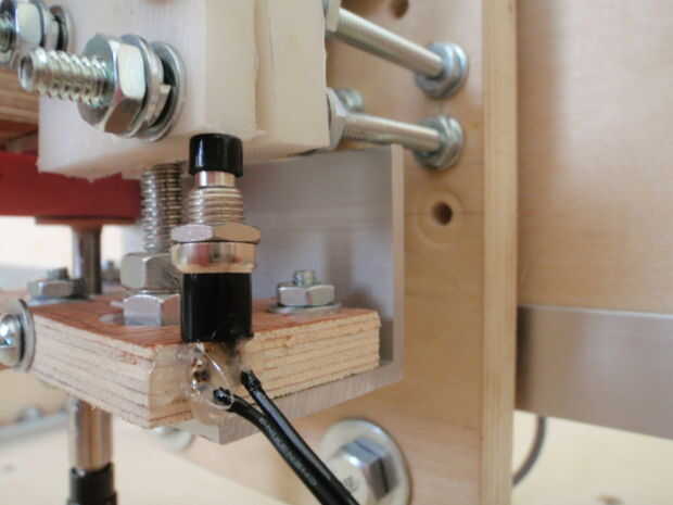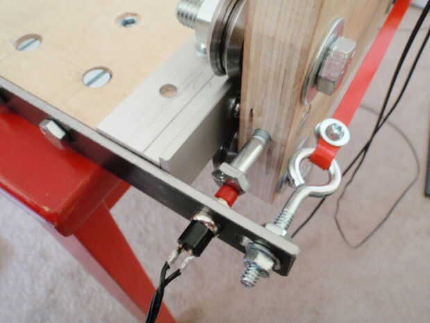 15.2 Conecte un interruptor de límite rojo (Y casa) con el apoyo de la correa delantera del lado que del interruptor "topes de límite" se instalaron en el paso 5.4. Un negro (Y límite) va en el mismo lado en la parte posterior. Interruptores de límite rojo designan posición y negro, grados de recorrido. Fotos #2-4 muestran cómo el límite de interruptor de interfaces con el interruptor de límite "parachoques". El hilo para el interruptor de inicio se ejecuta bajo la mesa a la caja del controlador y el interruptor en la parte trasera simplemente cae estrecho en la caja.