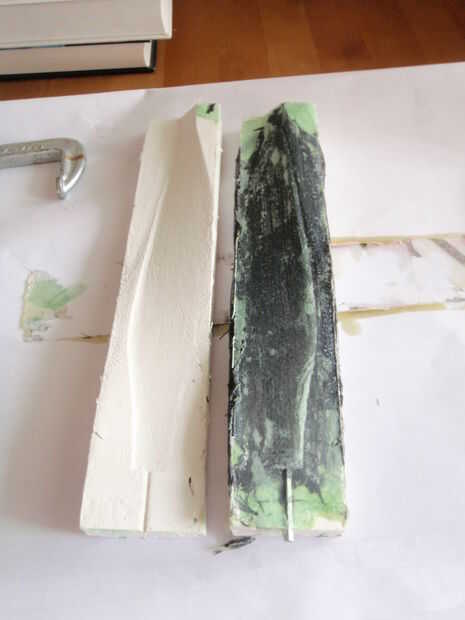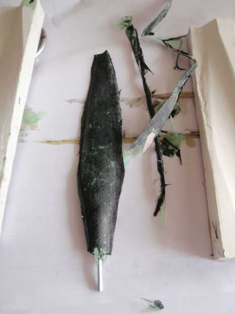 Después de doce horas el epoxi había cuajado pero no había endurecido completamente. Tenía un cuchillo alrededor de la costura y apareció el molde aparte con poca dificultad (Foto #9-11) me alegró al ver que la liberación del molde ha hecho su trabajo y el molde había sobrevivido con poco a ningún daño. Con una navaja recortan a la viruta en la hélice ya que es mucho más fácil hacerlo antes de que el epoxi endurece (foto #12). Con el exceso cortado Coloque la hélice en el molde para mantener su forma hasta que termine de curar.