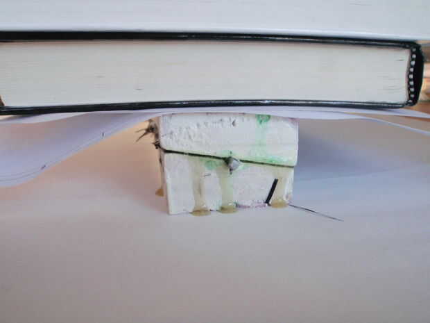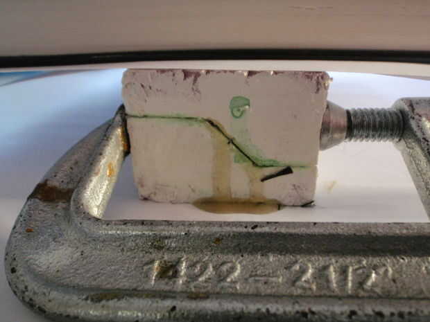 A continuación se que mezclan la resina y el endurecedor. Yo acabé necesitando 30ml de epoxy que se puede todos mezclar a la vez que ofrece un tiempo de trabajo de más de una hora. He aplicado una capa de epoxy de la superficie del molde y establecidas la primera tira de fibra de carbono (Foto #3). Mojé hacia fuera de la fibra asegurándose de que estaba completamente saturada y repite el procedimiento de establecimiento de una nueva capa y mojado hacia fuera. Cada nueva capa era más estrecha que la anterior construcción de grueso en el centro pero no en el borde de fuga donde disminuye el perfil. Progreso fue calibrado usando un palito atraviese el molde como en la foto #4 que muestra qué áreas requieren más fibra. Una sección larga de 2" de 1/8" acciones clave fue encajada en la hélice con 1" que sobresale. Recortes pequeños fueron utilizados para embalar alrededor del eje. Cuando un lado del molde se construyó el espesor requerido se puso la segunda mitad de la misma manera. Con ambas mitades terminados los moldes fueron reunió y alineados (Foto #5). Con el molde forrado hasta una pila de libros de texto (yo sabía que vendría en práctico algún día) fue colocada en la parte superior compresión juntos. Una buena cantidad de epoxi y fibra de carbono vino hacia fuera en la costura me que alegre que había aplicado esa capa de vaselina a los lados. Foto #6-8. El final del molde en la punta de la hélice tenía una tendencia a deslizarse aparte debido a la superficie inclinada. Una abrazadera en C mantuvo el molde alineado en este extremo.