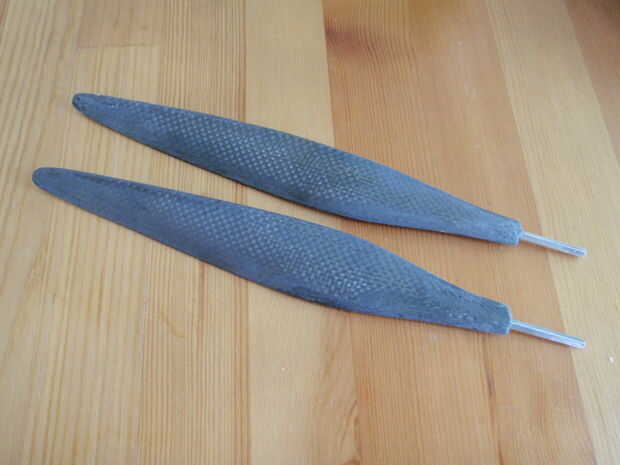 Después de la segunda hélice se había sentado durante 30 horas el epoxi había puesto completamente y estaba listo para lijar. Usé 120 arena arena y papel de una lija grano 220 mojado seco. Lijado húmedo es más eficaz que seca y elimina el polvo de carbón desagradable que sería producido de otra manera. Después de limpiar los bordes de fuga y líderes así como ausentes defectos menores de la superficie de lijado las hélices parecía como se muestra en la foto #14. Son suave pero opaco. Para terminar las hélices apliqué cuatro capas ligeras de acabado de brillo claro (foto #15). Capas finas son importantes Que me excitó y establecido demasiado acabado causando funcionamientos que debían eliminarse con papel de lija 600.