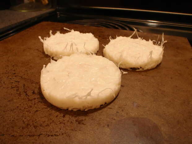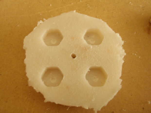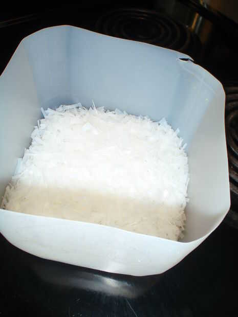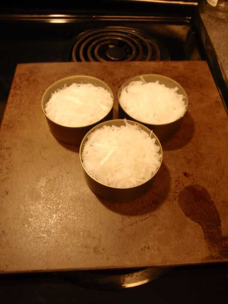 Después de media hora retirar las latas del horno y presione hacia abajo los copos parcialmente fundidos con una cuchara vieja para comprimir el material y tratar de eliminar cualquier huecos (Foto #5). Si las latas están fuera del horno durante un minuto más o menos las extremidades comenzará a enfriar y transición de opaco a blanco.