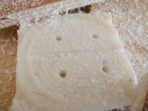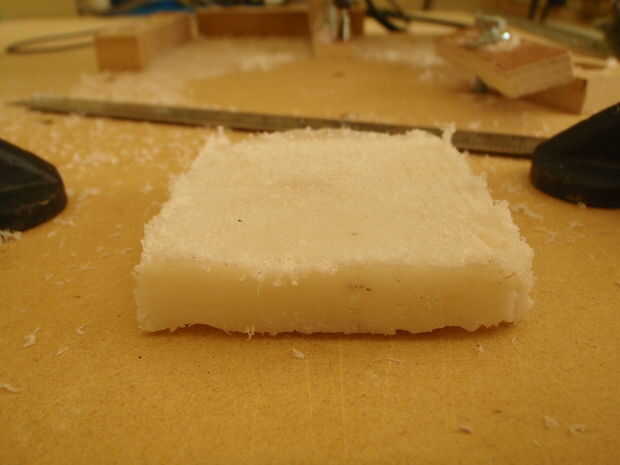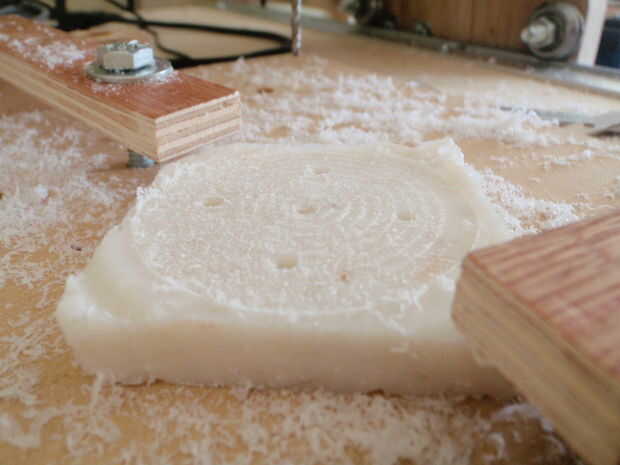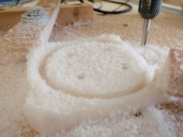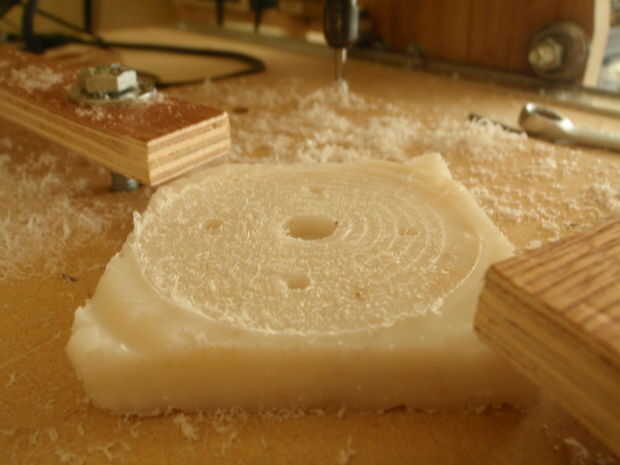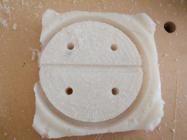 Después de enfriar el plástico reciclado está listo para ser trabajado a máquina en ejes de hélice. A partir del centro superior es la superficie trabajada a máquina plana (Foto #8). El plástico sobrante se corta usando un hack Sierra (Foto #9). El pedazo entonces se volcó y se mecaniza la superficie inferior plana (foto Nº 10). A continuación los cinco hoyos se mecanizan con un molino de extremo (foto #11) y luego el hueco para la cabeza del perno (foto #12). Se corta una ranura de 1/8" para los ejes de la hélice (foto Nº 13). El último paso de este lado es para recortar el perfil circular. La parte ahora es volteada y cortan huecos para las tuercas (Foto 14).