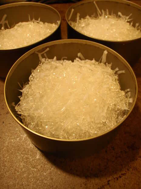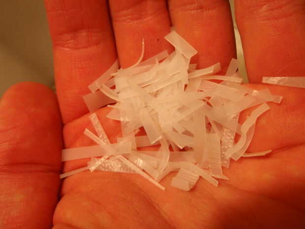 El primer paso es limpiar algunos jarros de leche, sacar las etiquetas y reducirlos en escamas. Lo hago con un par de tijeras mientras mira tv. Sólo puedo hacer unos cuatro jarras a la vez que toma alrededor de una hora antes de empezar a conseguir las ampollas de utilizando las tijeras. Las escamas deben ser tan pequeñas como usted tiene la paciencia para, como reducir el tamaño a la mitad requiere cuatro veces el tiempo de corte. Menor las escamas son más fácil será eliminar huecos en el plástico. Cortar los jarros de leche a mano es muy tedioso y he tratado de encontrar mejores métodos. Puedo decirles que no funciona es utilizar una trituradora de papel. HPDE se utiliza en tapas de tick tac ya que es muy flexible y no romperse debido a la fatiga cuando se flexiona. Esta propiedad significa que no puede destruir en la destructora de papel sino que se deforme lo suficiente como para ir en la mitad y se atascan. Corte cuatro jarras de leche, con el objetivo de escamas 3/4 "x 1/8" en tamaño (fotos # 1, 2).