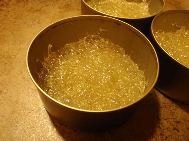 Yo seguí poniendo en las latas en para temporadas media hora y después de dos horas completamente fueron derretidos. Les di un último Pulse con una cuchara para tratar de obtener la superficie como incluso como sea posible para reducir al mínimo después de mecanizado. Foto #6. Cuando completamente derretido son completamente opacos. El material no es líquido pero tiene una consistencia pegajosa, pegajosa.