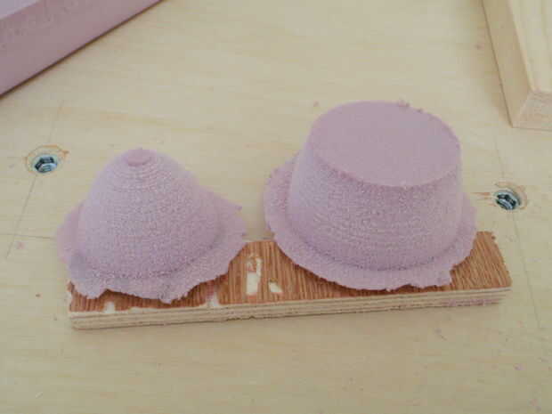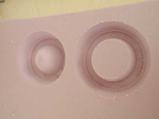 Para construir un enchufe fue trabajado a máquina de 1" la espuma de poliestireno en dos mitades (Foto #1). 0,05" quedó en la parte inferior para dejar las piezas suelta en la última pasada (Foto #2, es necesario aprender a usar la celebración cuentan con pestañas de CamBam cuando llegue el momento). Los dos havles entonces estaban pegados con una fina capa de pegamento blanco después de la viruta fue quitada con un knif utilidad y algún papel de lija de 220 grano (Foto #3).