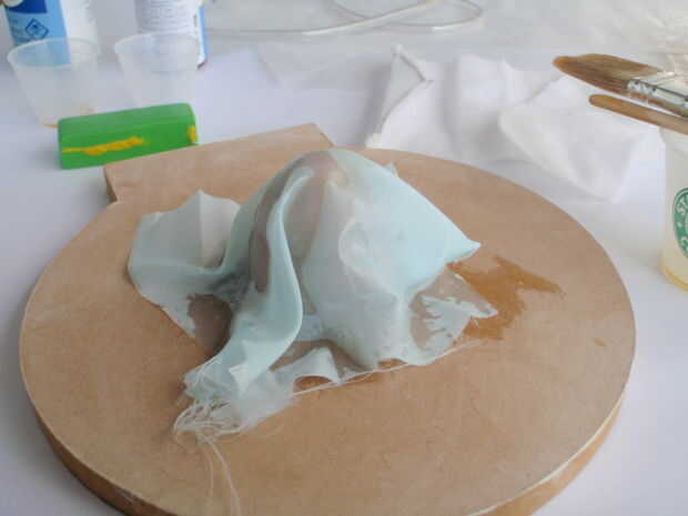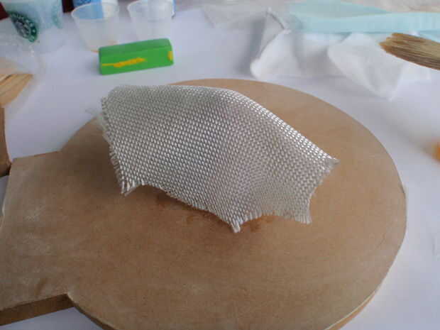 -A partir de la fiberglassing contacto con una pieza de fibra de vidrio tela 3 "x 3" (más grande que la base del cono) en la pieza de MDF encerada. Foto #6