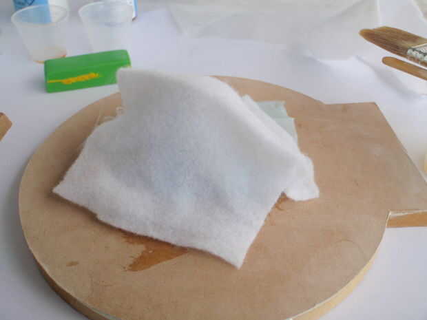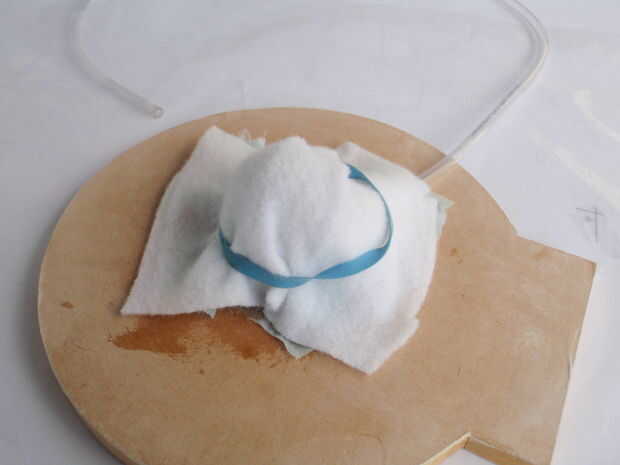 - Y luego una capa de paño del respiradero (foto #11). Pongo una banda elástica alrededor de todo en esta etapa para mantener todo junto mientras hice la bolsa. Foto #12
