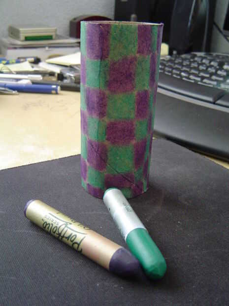 En lugar de usar lápices de colores, utilicé pasteles al óleo y hace el mismo patrón como lo hice en la bolsa de papel. Los pasteles que he utilizado tienen una consistencia cremosa y suave, así que fue capaz de suavizar el patrón cuadrado con mis dedos y hecho un patrón completo en el rodillo exterior, que resultó para ser muy agradable.