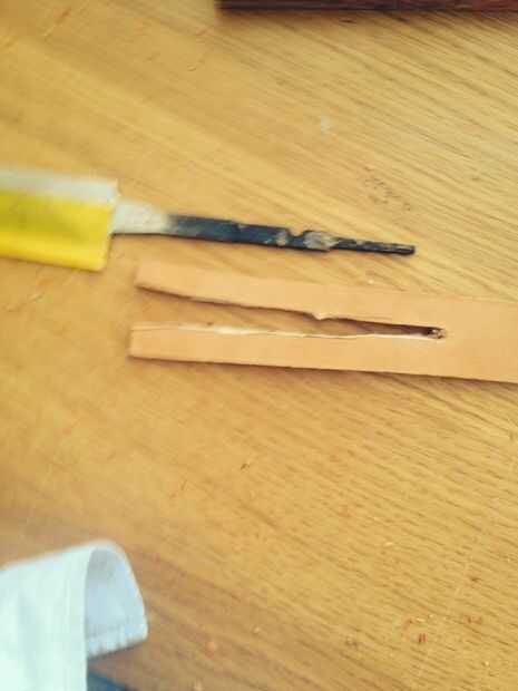 Cortar una tira de cuero ligeramente más grande que el mango está planeando. Recortar el perfil del eje. Las fotos explican mejor que las palabras!