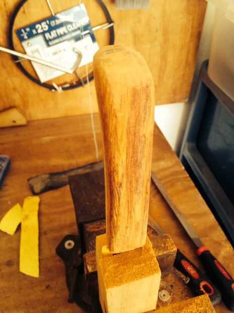 Cuando esté satisfecho con la forma básica de su manija es tiempo de arena para un acabado suave y agradable. Para ello, lijado del mango con el grado más fino y más fino de papel de lija. A partir de quizás 80 - cambiar 150 240 y 400. Asegúrese de que haces todos los rasguños de la desaparecer de grado anterior antes de cambiar a un grado más fino. Parar después de usar el papel 400 grado. Es el momento de teñir la madera!