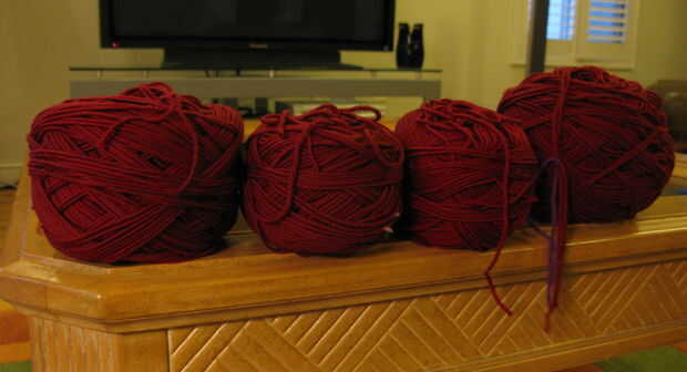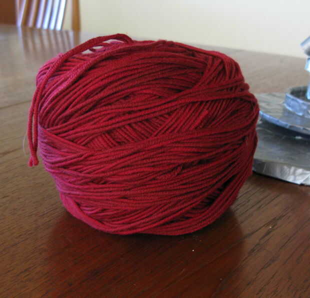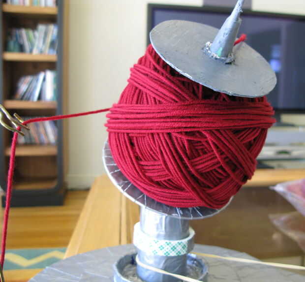 Utilizando un hilo de Swift con la devanadera de la bola es una buena idea. Hice un rápido de perchas de alambre, una botella de vino, cinta adhesiva y una caja para estabilizar la botella. Es una versión modificada del hilo de Swift en http://aemmeleia.wordpress.com/2007/09/05/diy-yarn-swift-desparate-measures/. Usé 6 perchas en vez de 4 y poner la botella en una caja. No cuesta nada!