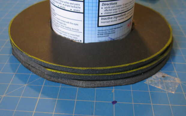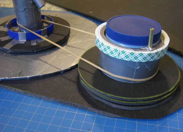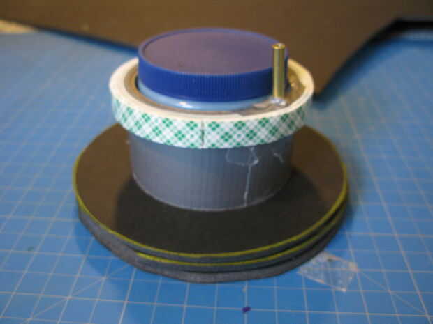 * Necesitaba levantar el rollo de cinta de conducto para obtener la altura de la goma con la altura en el estabilizador de la vuelta. I cortar varios círculos adicionales de la base de la espuma y cortar agujeros en el centro de ellos para caber en el frasco. El rodillo de la cinta del conducto se basaba en la parte superior de la base de la espuma y el ángulo de la impulsión de goma era fijo.