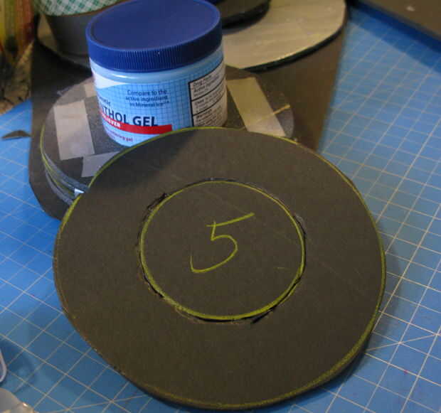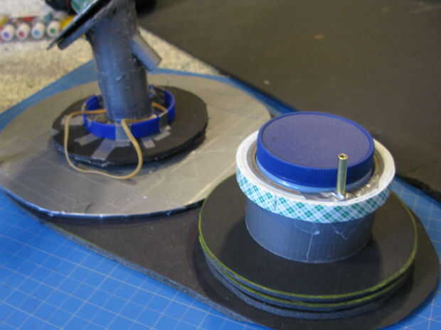 Con cinta adhesiva, fije Lazy Susan para el extremo más grande de la base. Determinar la colocación del arreglo del tarro/cilindro.