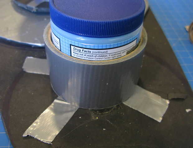 Encontrar un tarro o cilindro que se ajusta bastante bien (no ajustado) en un cilindro que tiene un diámetro mayor que el diámetro del tubo del estabilizador de la vuelta. He usado un tarro CVS de músculo frote cosas y mi rollo de cinta de conducto casi vacía. El diámetro es necesario para que las rotaciones de lo Turner son menos de las rotaciones del estabilizador de la vuelta. Lógica sin los engranajes del engranaje (aunque he ordenado algunas marchas para eventualmente modificar el diseño).