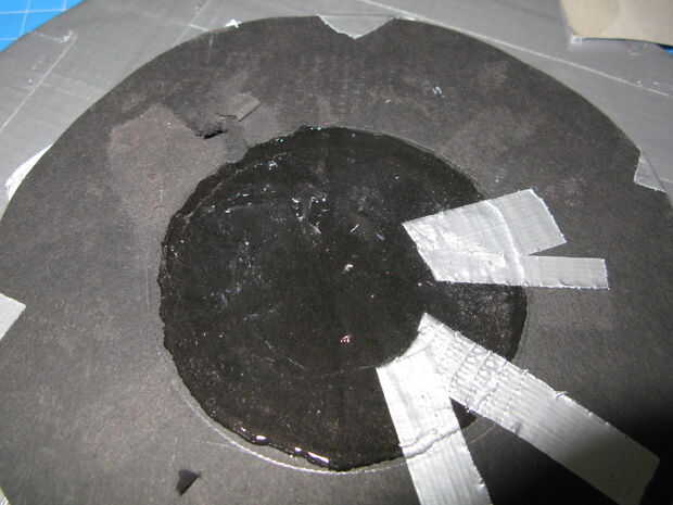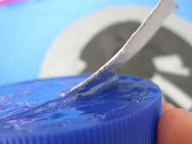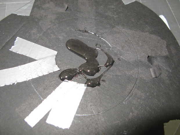 4. Extender el cemento de contacto o utilice cinta de palillo doble super fuerte en el trazo y en el lado plano del disco. Permita que el cemento de contacto se pegajoso.
