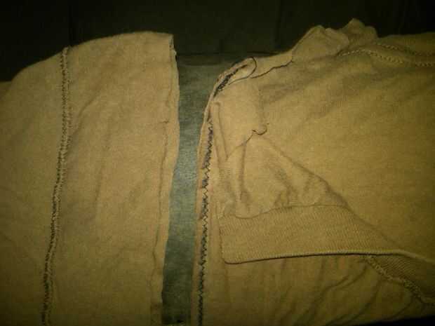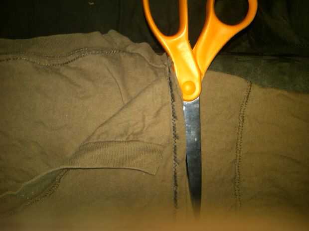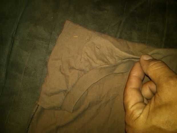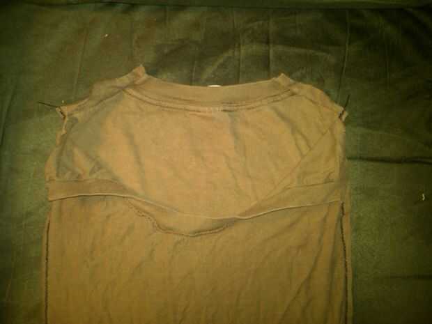 corte las partes exteriores (mangas) dejando intacto su costura. También corte el área del cuello de la camiseta como se muestra, baje para crear un borde incluso y virar en su lugar. Camiseta debe estar adentro hacia fuera.
