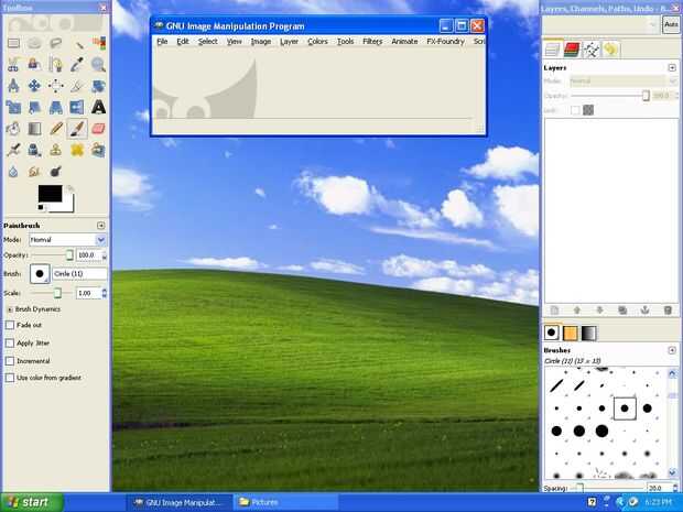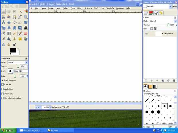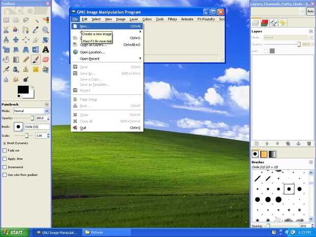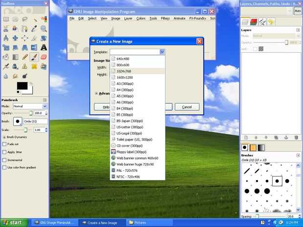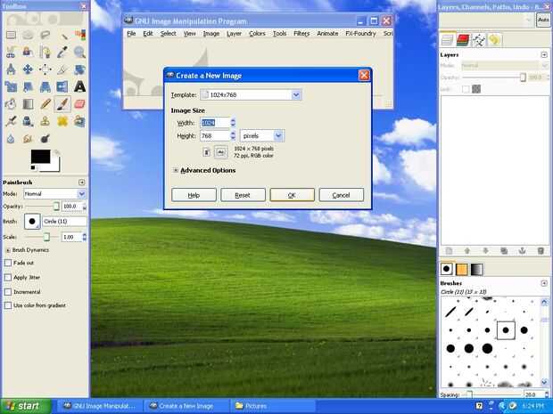Gimp abierto haciendo clic en el acceso directo en el escritorio (sigue aburrido). Haga clic en el botón de archivo en la esquina superior derecha de la ventana de edición y a continuación, haga clic en nuevo. Ahora buscan la resolución de su pantalla en el menú desplegable con la etiqueta "plantilla:" en la ventana que se abrirá. Si no ves que aparece, puede escribir manualmente en a través de los cuadros anchura y altura más abajo. Al seleccionar la resolución de su pantalla, haga clic en Aceptar para confirmar y abrir un lienzo en blanco que vamos a utilizar para pintar en.