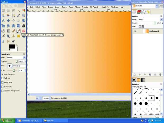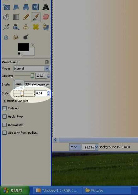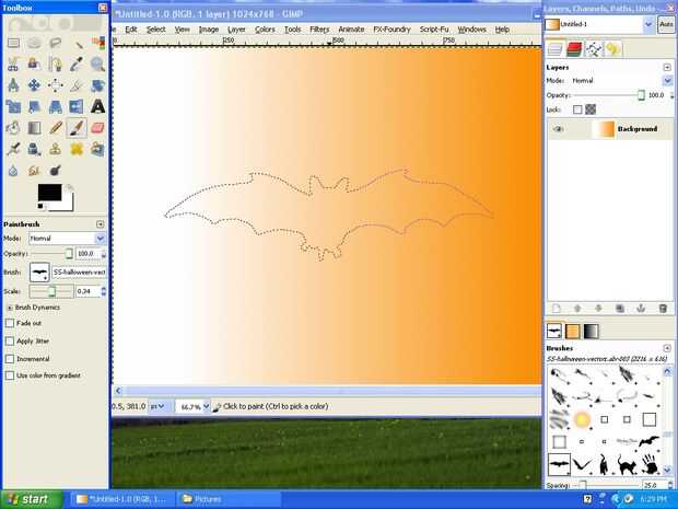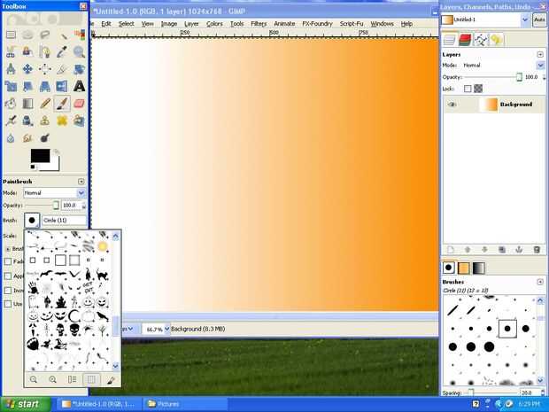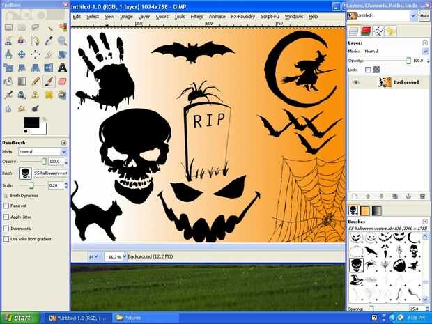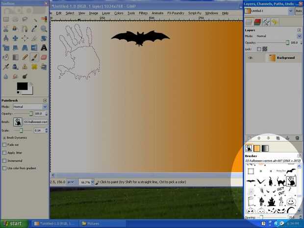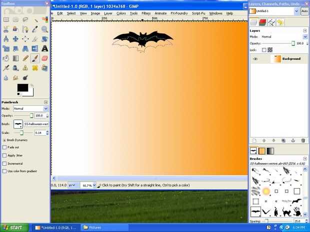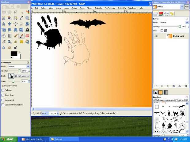 Antes de que podemos colocar sellos en el telón de fondo, necesitamos cambiar nuestros colores a colores por defecto por lo que destaca. Decidí usar negro. Para cambiar los colores a la normalidad, haga clic en los cuadrados blanco y negro más pequeño por debajo de los grandes a la izquierda. Ahora seleccione la herramienta pincel en el cuadro de herramientas. Por defecto, tu pincel será un gran punto negro. Para cambiar a los pinceles de Halloween que instalamos, desplácese hacia abajo a través de las escobillas de caja en la esquina inferior derecha y usted debe ver. Seleccione uno quieres utilizar. Puede cambiar el tamaño de su sello (ya que probablemente será enorme al principio), por arrastre el deslizador de "Escala" de la izquierda. Ahora haga clic una vez en la lona y lo verá aparecer. Hacer esto tantas veces como desee con tantos pinceles como quieras hasta su satisfacción. Use diferentes tamaños e incluso colores para subrayar elementos diferentes. Recuerde, usted puede deshacer tantas veces como desee haciendo clic en Edición > Deshacer o presionando Ctrl + Z. Personalización adicional, puede Agregar texto como su nombre o lo que sea haciendo clic en la A grande en la caja de herramientas y seleccionando una caja en la lona. Puede editar la fuente y tamaño en la configuración del cuadro de texto.