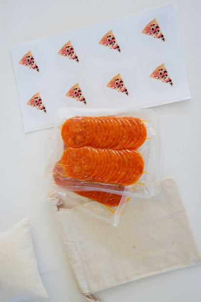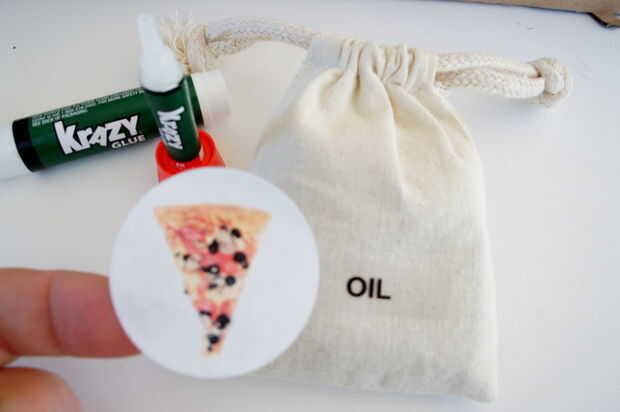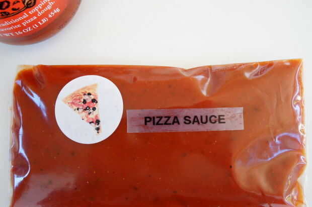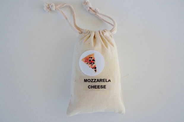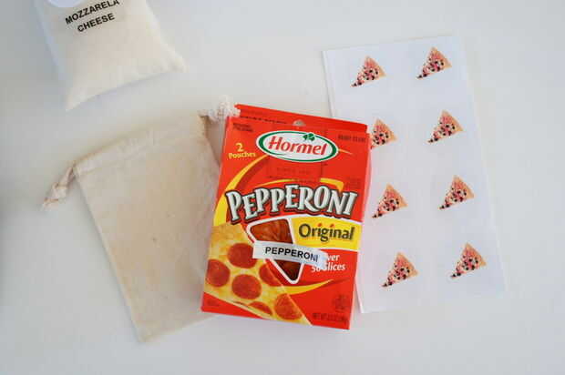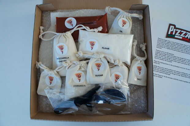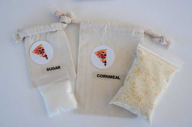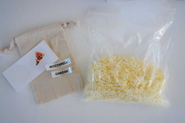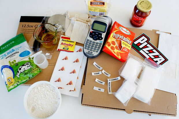 Para montar el kit, utilizar la máquina de etiqueta para imprimir una etiqueta para cada ingrediente. Mida todos los ingredientes. Coloque todos los ingredientes excepto la salsa de pizza, queso mozzarella y harina en los más pequeños bolsos ziplock. Luego colocarlos en bolsas de muselina basados en su tamaño de coordinación. Poner el queso mozzarella en una de las bolsas de ziplock tamaño de cuarto de galón. Doble la bolsa sobre un par de veces y luego la cinta la parte posterior. Poner el queso en una bolsa de muselina. Utilice las restantes bolsas de tamaño cuarto de galón de salsa de pizza y harina. Plegar las bolsas y luego la cinta la parte posterior. Use super pegamento para pegamento las pegatinas para las bolsas de muselina y pegar las etiquetas.