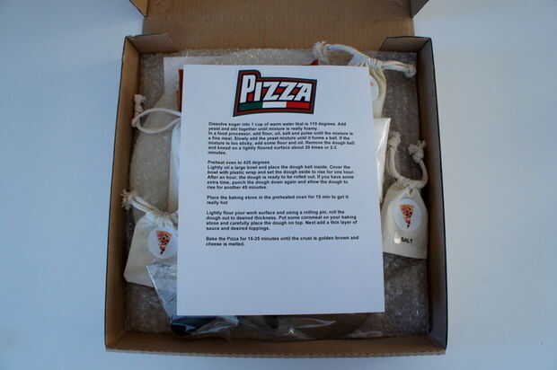 Coloque la piedra para pizza en la parte inferior de la caja de la pizza. A continuación, ponga todos los ingredientes dentro de la caja. Poner el cortador de la pizza dentro y colocar la receta en la parte superior. Si han medido todos los ingredientes correctamente, debe cerrar la caja de la pizza sin ningún problema. Si encuentra que abulta un poco, puede cinta a los lados.