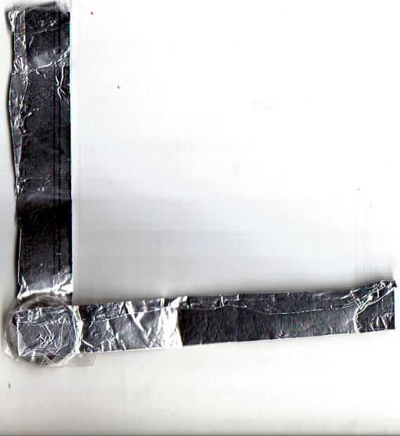 Envuelva una tira muy estrecha de la cinta scotch alrededor del borde exterior de la batería. Corte 2 piezas de papel de aluminio de 1" de ancho por 3½" de largo. Doblar las tiras de papel en mitad a lo largo y liso la hoja hacia fuera con el dedo. Utilizando claro envío de la cinta, la cinta el extremo de una tira de papel de aluminio + lateral de la batería y la segunda tira de papel al otro lado de la batería como se muestra onin la figura. Presione la cinta fuerte conseguir la cinta y papel para la batería.