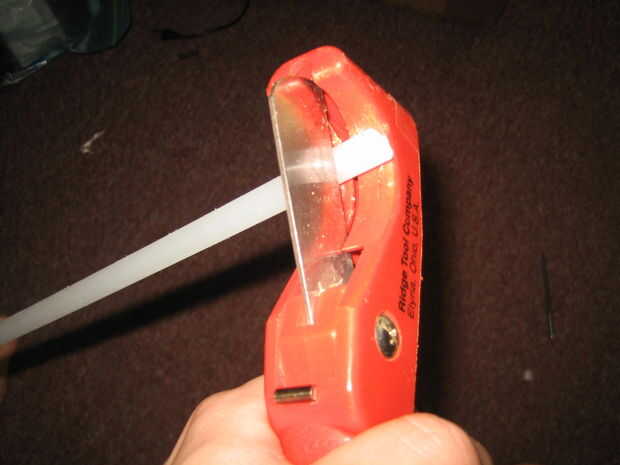 Una vez que has cortado las piezas a la medida. Perfore un agujero en el centro de la broca de plástico con la broca #11. Si se realiza correctamente, el LED debería caber estrechamente en este agujero. No inserte los LEDs hasta después de haber aserrado la ranura. Para sujetar el tubo mientras la perforación te puede sujetar a algo con la barra de la abrazadera o ponerlo suavemente en un tornillo de banco o mesa de trabajo. Si estás usando un tornillo de banco, asegúrese de que la almohadilla para que no Cave en el plástico.