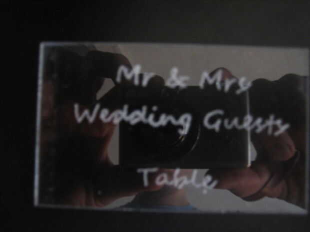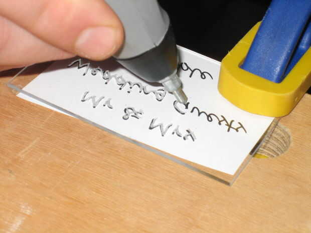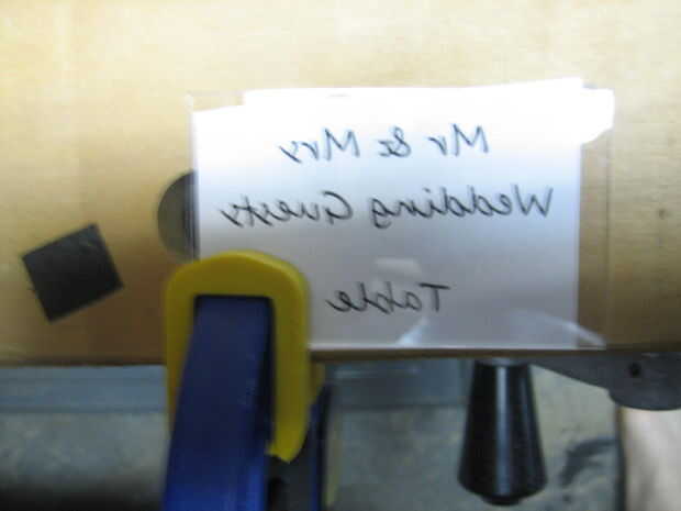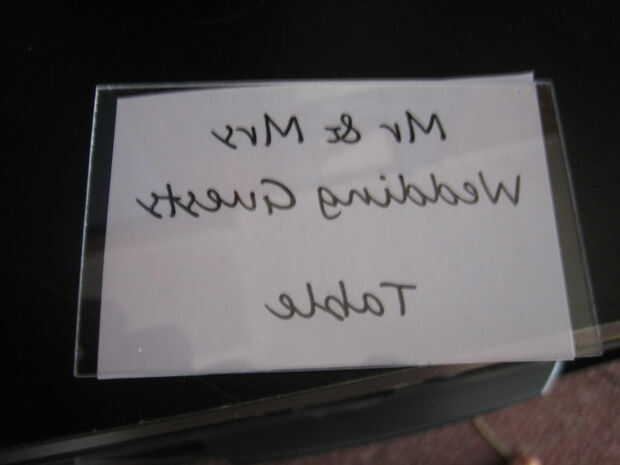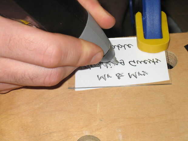 Para comenzar, imprime el texto que desee en sus tarjetas VOLTEADAS hacia atrás. Puede usar Open Office dibujar (que) u otro programa de dibujo para hacer una plantilla para cada tarjeta que es 3 1/4 "x 2". Desde allí puede ingresar el texto y luego use la función flip a hacer un espejo del texto horizontalmente. Terminas con atrás texto que se colocan en el acrílico. He utilizado la fuente "Segoe Script" del Open Office en un tamaño de fuente 22. Para nombres particularmente largos que me pareció mejor simplemente golpear el tamaño de la fuente hacia abajo un poco, cualquier cosa size18 y sobre seguirá siendo un montón grande.