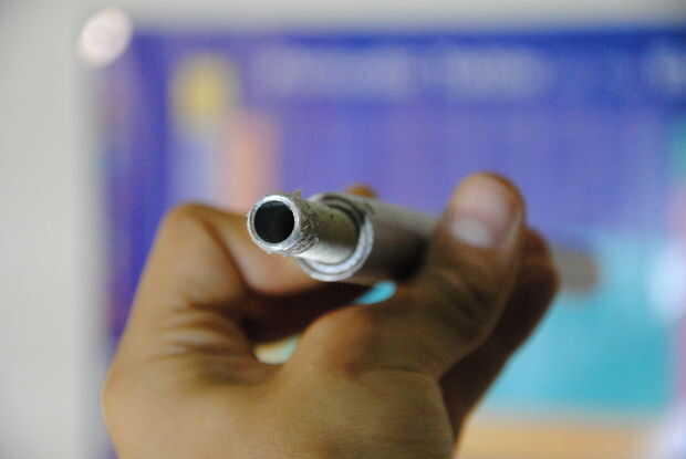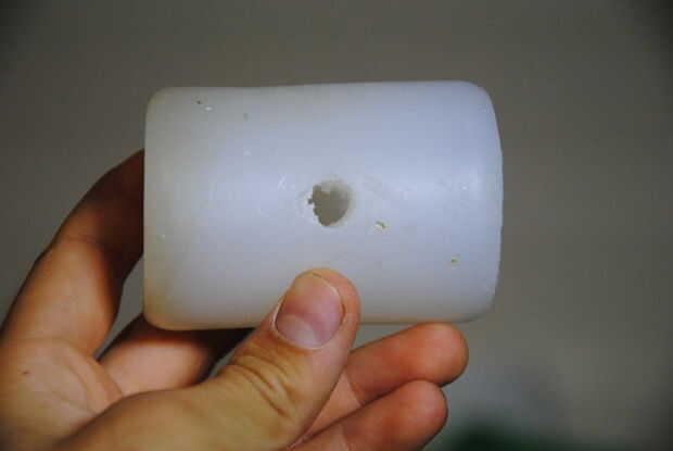 Sujeta el molde caliente pegamento en mi torno madera casero y utilizan un taladro para perforar un agujero en el centro del molde, sobre ¾ de la manera en. Esto servirá como un agujero que mango del macillo que haz insertado en.