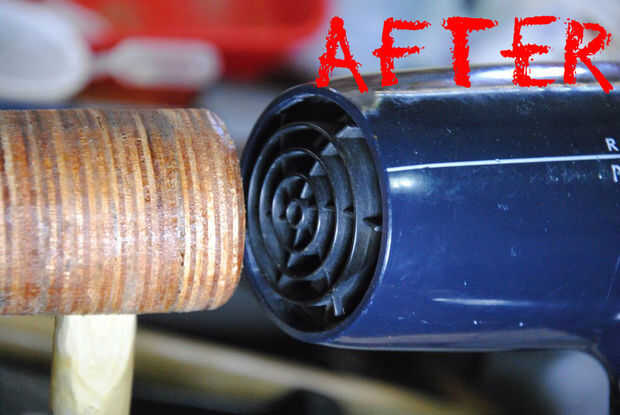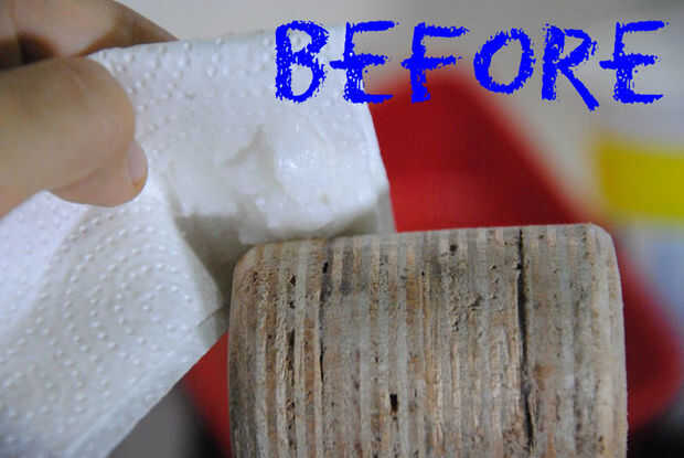 En primer lugar, untó sobre una cucharada de aceite de coco con una toalla de papel sobre el mazo, y luego utilicé un secador de pelo caliente para difundir más uniformemente porque real aceite de coco se convierte en un líquido a 24° C (76 ° F)