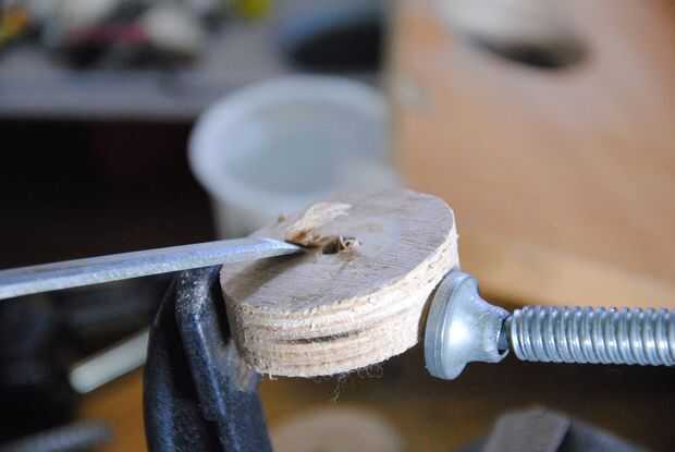 En primer lugar, raspa lo apagado con un cuchillo afilado. El cuchillo no podía alcanzar la parte media de la clavija de madera, por lo que lo distancia, con un cincel, había cincelado por supuesto!