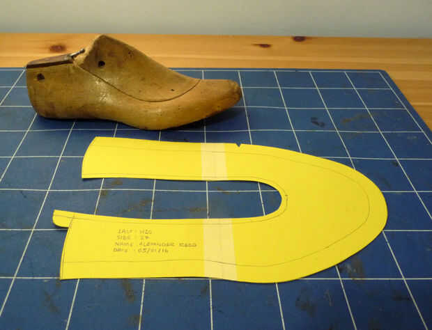 La pieza está ahora lista para corte de cuero, cosido y probado para ver cómo se ve. Diseño de zapatos, el patrón puede ser probado y alterado muchas veces antes de entre en producción.